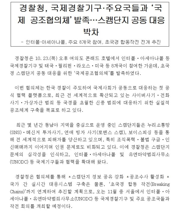 경찰청, 국제경찰기구·주요국들과 ‘국제 공조협의체’ 발족…스캠단지 공동 대응 박차