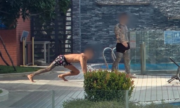 메콩강이 내려다보이는 수영장 근처에서 전신 문신을 한 남성 3명이 운동 중인 모습이 포착됐다.