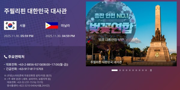 필리핀 한인 총연합회 : +63-2-8886-4848, 사건사고 긴급시: +63-917-886-4848