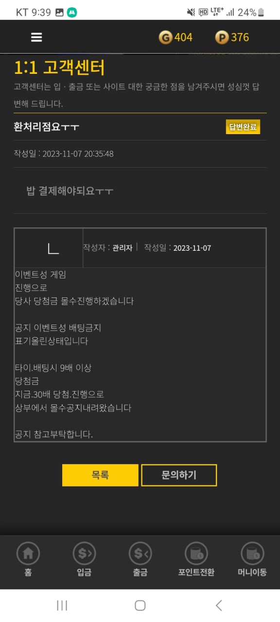 이벤트성 게임을 했다고 당첨금 300을 몰수시켰습니다.