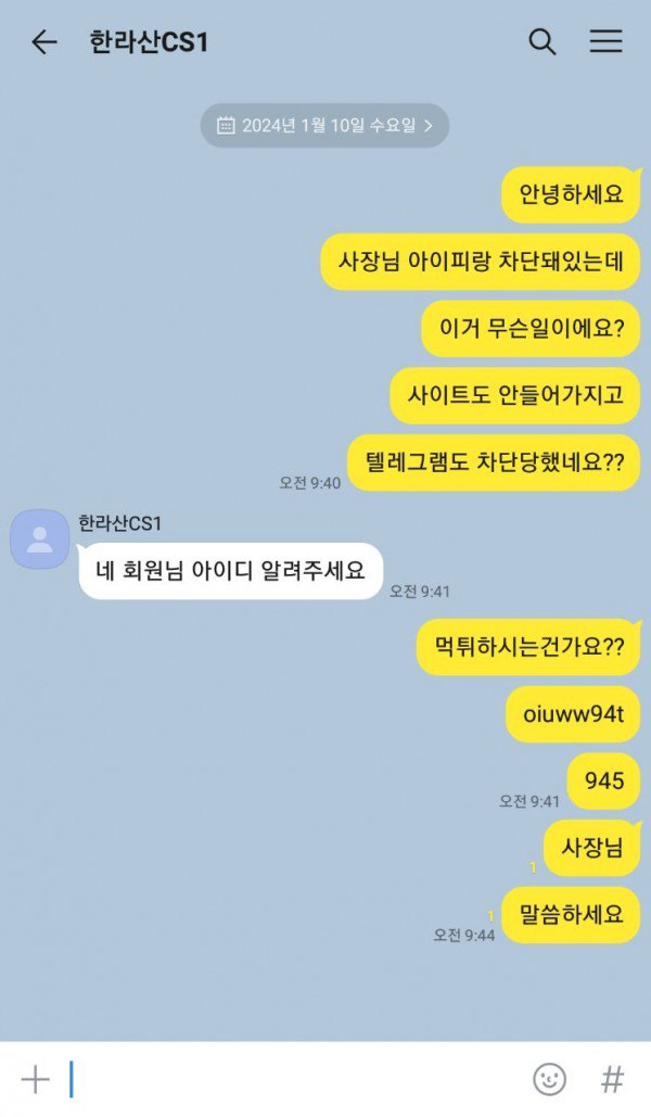 진짜 어이가 없어서 오늘 아침에 카톡까지 해서 아이디 알려주니까 바로 또 차단하네요