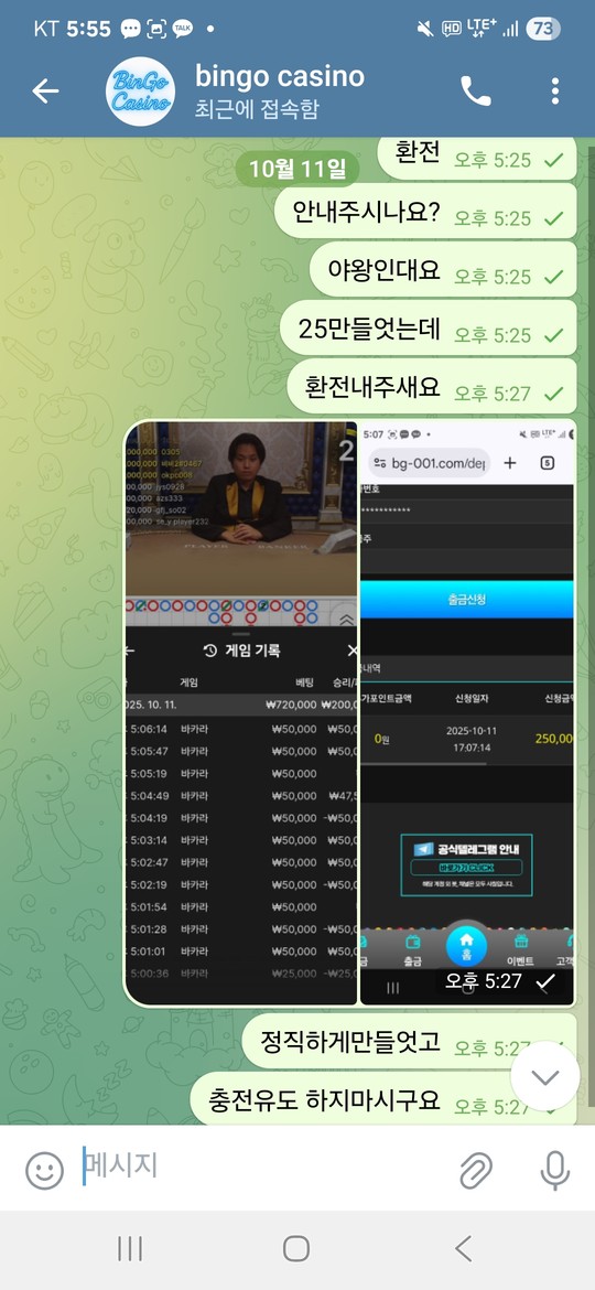 25만원까지 수익을 올렸지만, 환전을 시도하자 충전을 요구하며 환전을 막는 사기 행위를 겪었습니다.