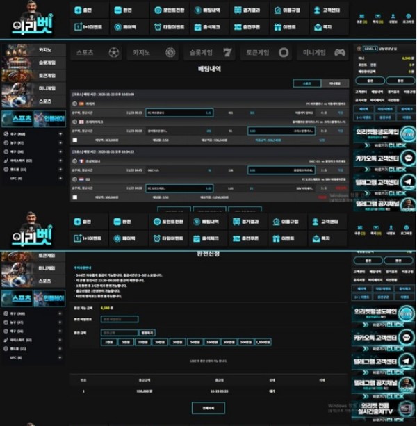 홍보 문자 안내를 통해 의리벳에 가입하여 첫날 두 차례 충전(각 30만 원)을 진행했습니다.